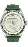 Item DescriptionSport watch, Quartz movement, Polished silver-tone hands with luminous accents, Analog date display, Black markers and indices, Green border accent, Polished stainless steel silver-tone bezel, case, crown and screw in caseback, 50 meters/165 feet water resistant |