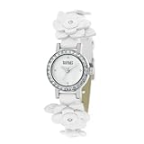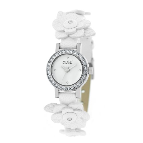 Badgley Mischka Item ID: #2256Badgley Mischka Women’s BA1137WTWT Swarovski Crystals Silver-Tone “Flower” Applique White Leather Strap WatchProduct Information: