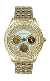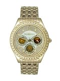 Item DescriptionQuartz movement, Dress watch, Polished gold-tone hands with small crystal accents, Polished gold-tone number, Crystal accents on subdials, Crystal markers, Black numbers and indices on outer dial, Polished stainless steel gold-tone bezel with crystal accents, Polished stainless steel gold-tone case and crown, Polished stainless steel silver-tone caseback, Water resistant |
