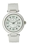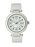 Item DescriptionCasual watch, Japanese quartz movement, Polished silver-tone hands with luminous accents and sweep seconds, Applied luminescent polished silver-tone Arabic numbers mark quarter-hour positions, Applied polished silver-tone crystal baton markers, Black Arabic numbers and indices form inner minute track, Applied luminescent dot hour markers (at quarter-hour positions) and black dot indices form surrounding minute track, Analog date aperture at three o’clock, White dial, White bracelet-style rubber strap with brushed silver-tone stainless steel push-button-clasp-with-safety, Polished silver-tone metal bezel with glossy white resin top ring, Polished silver-tone metal round case with striated hinges, Textured metal crown with white detailing, Stainless steel caseback, Mineral crystal |