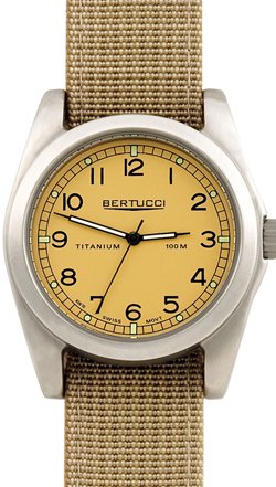 Bertucci Item ID: #3495Bertucci A-3T Vintage 42 Titanium Watch with Khaki Nylon Strap 13306Item DescriptionThe A-3T Vintage 42TM watch is a retro WWII influenced design with a round brushed titanium case. Its desert stone yellow dial features a traditional black seconds hand with luminous hour and minute hands. Inside is an all-metal jeweled quartz movement with a 5-year battery. Includes unbreakable titanium band bars at the lugs and a one piece DX3TM nylon strap. Comes with a titanium screw-in case back, screw-down crown and a scratch resistant mineral crystal. Case : Brushed titanium, 42mm diameter, 14.5mm thick. Band : Integrated Khaki (2-ply) nylon strap with buckle and catcher. Water Resistant : 100 meters. Warranty : 3 Years. |