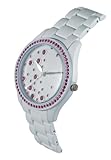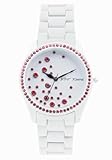 Item DescriptionThe Betsey Johnson Women’s Sweetie Pie Collection White Dial Bracelet Watch is a striking casual accessory with its white-and-red color palette and glittering crystal accents. Constructed with a brass case, the watch includes a large brass bezel with red crystal accents, and a white brass link bracelet with fold-over clasp. A durable mineral window shields the white dial face, which features more bright red crystals in a half-circle design offset by dramatic black watch hands. Powered by analog-quartz movement, the watch is water resistant to 99 feet. |
