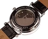 Mineral crystal glass. White or black dial with white/black/gold/rosegold ornamentals, hands, crown, and patched numerals .
