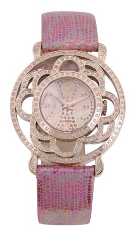 Item DescriptionThis stainless steel timepiece has a natural mother-of-pearl dial and a unique satin calf leather strap. Fine white diamonds on the intricate rose-gold plated case complete this elegant design. |