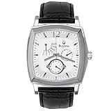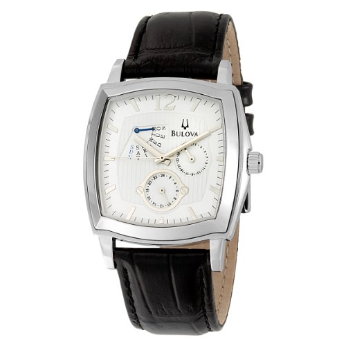 Item DescriptionGet an instant style update with this bold and modern multifunction watch from Bulova. The barrel-shaped polished steel case highlights a crisp white dial with silvertone baton hands and markers, a sweep seconds hand and seconds indexes, and an Arabic numeral 12. Two round subdials display the date and 24-hour time, and a third fan-shaped dial with a blue hand displays the day of the week. This watch is showcased on a black crocodile leather strap finished with a steel buckle. A handsome accessory for any occasion, this Bulova watch offers reliable Japanese quartz movement and water resistance to 99 feet (30 meters). |