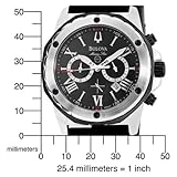 Item DescriptionA bold look and innovative styling define the Bulova Men’s Marine Star Black Dial Strap Watch. Framed by a stainless steel bezel with black screw details and a matching outer ring, the textured, black dial features a combination of Roman numerals and linear indexes, an outside minute track with red and white Arabic numbers marking every five minutes, and arrow-shaped hands with luminous fill. Three useful sub-dials offer chronograph functions, and a convenient date display sits between four and five o’clock. Detailed with a tapered edge, the durable, black rubber strap fastens with a traditional buckle for an adjustable fit. Water resistant to 330 feet (100 meters), this high-performance timepiece will stand up to your active and independent lifestyle. |