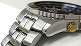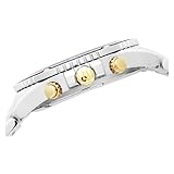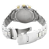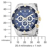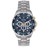Item DescriptionLending elegant style with a sporty state of mind, the two-tone Bulova Marine Star men’s chronograph watch travels easily between formal business and sporty casual wear. The large, round polished silver stainless steel watch case measures 42mm (1.65 inches) wide and is topped by a unidirectional rotating elapsed time bezel with white engraved 10-minute marks. This watch features 24-karat ion-plated crown, chrono push-buttons, and bezel accents. The dark blue dial includes three chronograph subdials (chrono minutes, seconds, and 24-hour) outlined in silver. It also offers luminous gold-outlined hands (with seconds hand), luminous markers, small minute indexes on the outer dial, and a date window between 4 and 5 o’clock. The brushed stainless steel bracelet band offers a thin, gold-tone accent running down the middle, and it’s joined by fold-over deployment clasp. This precise quartz timepiece also features a scratch-resistant mineral crystal and water resistance to 100 meters (330 feet). |
