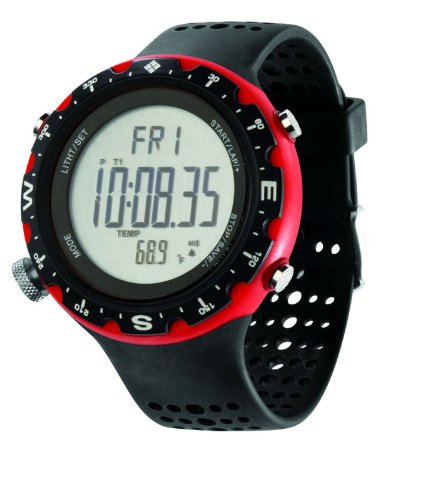 Item DescriptionIf it’s true that experience brings wisdom; then Columbia Sportswears more than 70 years in business should mean we know a thing or two about making great outdoor gear. We like to think so. Band Color : Black Rubber; Band Width : 24mm near case; 24mm near clasp/buckle; Bezel Color : Black; Case : Red + Circle-shaped; Case Finish : Flat + Plastic; Case Thickness : 15mm; Case Width : 50mm; 55mm with crown; Clasp / Buckle : Strap Buckle; Dial : Indiglow + digital; Hand Color : Indiglow; Movement : Other + other; Time Zones : Single; Water Resistance : 10 atm; Other Features : Backlight; Compass; Temperature gauge; 50 lap memory; 10-run data storage |
