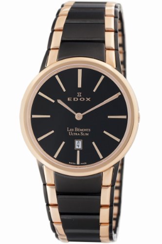 Item DescriptionThis Edox Les Bemonts watch is a beautiful Swiss timepiece. The ultra slim black textured round dial featuring a date window is protected by a sapphire crystal and has a rose-gold PVD coated bezel. The black and rose-gold PVD coated stainless steel bracelet closes with a deployment clasp and is water resistant up to 30 meters. You can be sure to awe the audience with this exquisite watch. |