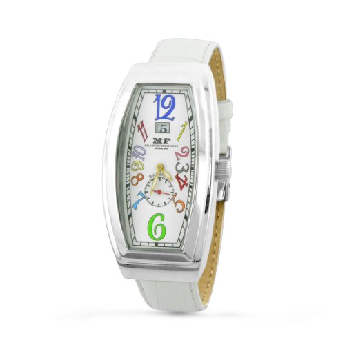 Item DescriptionA true conversation piece, the Franchi Menotti Men’s Banana Collection White with Numbers Dial Watch #3000 instantly charms with its bright white tonneau dial, multi-colored Arabic numeral hour markers, and sleek white leather band. All stainless steel construction provides long-term beauty and durability, while miyota gp10 movement ensures optimum precision. A day display and seconds dial help keep you on-track, and water resistance to 165 feet (50 meters) guards against wear and tear. |