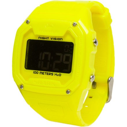 Item DescriptionWhen your digital watch from ’86 turned in for the decade you may have felt like a part of you was missing. Stop your longing and replace your missing piece with the Freestyle Killer Shark Watch. The classic styling will go well with your British knights and letterman jacket. An easy-to-read LCD display features time, day, and date. Two alarms keep you on time, and the stopwatch will make world-record breaking attempts that much more legit. Aquatic adventures are viable thanks to the 100 meter rated waterproof case, and nighttime attacks are made easier with the NightVision Backlight Display. Product Features