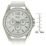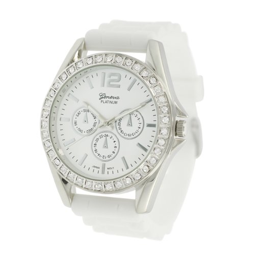 Geneva Item ID: #1744Geneva Women’s Platinum White Chronograph-style Silicone WatchItem DescriptionThis watch features a silvertone bezel accented with sparkling rhinestones. The soft, silicone band and decorative subdials complete the look of this stylish timepiece. |