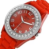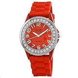 Be a trend setter with the “Savvy Jelly” watch by Golden Classic. This watch will empower your wardrobe and be a favorite amongst your friends. It has a chic sporty look that allows you to wear this when dressing up or down. The vibrant red color on the band and dial add color to your look, where the clear crystal encrusted bezel makes the watch an elegant march of time. Marked on the dial are silver hour markers that make time easy to read. A jelly strap and silver buckle holds the watch tight to your wrist. This watch was made for a fashionista.