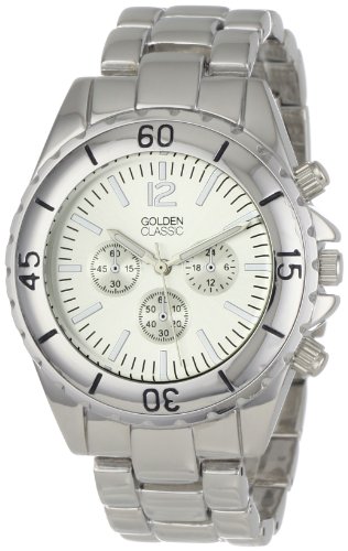 The “Nautical Notion” watch by Golden Classic is traditional in design with modern detailing. The silver bezel boasts contrasting black tachymeter markings. The silver face has silver time markings and contrasting hour and minute hands for easy and accurate time telling. The three non-working chronograph sub dials add luxury to your look. This watch sits comfortably on your wrist with a fold over clasp with double push button safety. Although it’s perfect for day time it can also be dressed up, making this new watch a must have staple for your watch collection.