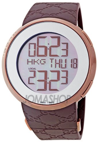 Item DescriptionBrown PVD stainless steel case with a brown “GG” rubber strap. Silver-tone digital dial with chronograph and date display. Alarm. Fixed stainless steel bezel.Quartz movement. Scratch resistant sapphire crystal. Case diameter : 44 mm. Deployment clasp. Water resistant at 30 meters (100 feet). Gucci 114 I-Gucci Mens Watch YA114209 |
