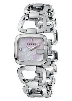 Item DescriptionSteel case with a steel bracelet. Fixed steel ‘g’ bezel. Mother of pearl dial with silver tone hands and diamond markers at the quarter hour positions hour markers. The gucci name apperas below the 12 o’clock position. Quartz movement. Scratch resistant sapphire crystal. Solid case back. Case diameter : 23.4 mm x 23.4 mm. Case thickness : 10.5 mm. Jewelry clasp. Water resistant at 30 meters/ 100 feet. Functions : hours, minutes, seconds. Gucci 125 G-Gucci Series Watch YA125502. |