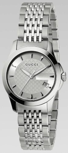 Item DescriptionStainless steel case with a stainless steel bracelet. Fixed bezel. Silver diamond pattern with silver gucci ‘G’ dial with luminous silver-tone hands and index hour markers. Date display appears at the 4 o’clock position. Quartz movement. Scratch resistant sapphire crystal. Textured steel crown. Stainless steel case back. Case diameter : 27 mm. Case thickness : 7 mm. Push button deployment clasp. Water resistant at 30 meters / 165 feet. Functions : hours, minutes, seconds, calendar. Gucci G Timeless Ladies Watch Stainless Steel with a Silver Dial YA126501. |