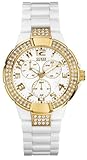 Item DescriptionMultifunction : Day, Date, 24 Hour/Intl. time Dimensions in mm : 40.5/40.5/19 Polished Gold-tone, crystal + white case White dial White polycarbonate bracelet 100M/330 FT 10 year warranty Women’s Accessories > Watches > Guess Watches |