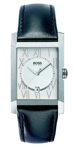 Item DescriptionNew elegant Hugo Boss stainless steel and black leather watch, 1512001 or HB.09.1.14.2000 Featuring : – Bright, clear pale silver rectangular dial; the dial has a polished silver ring which separates it into two portions – the indide which is plain + has the Hugo Boss logo at the top, and the outside which is textured. The textured portion has polished roman numerals for time-telling. On the ring its self there are fine black stick markers for seconds, and a date-display window sits on top of it at the 6 position (above the “IV” marker).- The hours, minutes and seconds hands are silver toned and polished.- The crown is tipped by black enamel with BOSS in silver-; The crown controls both the time and the date on the dial. – Screen is scratch proof mineral crystal- Case is polished ; case-back is brushed stainless steel- Case-back features engraved logo and model information- Genuine leather strap is coloured black and embossed with BOSS and GENUINE LEATHER on the back.- Steel buckle with BOSS engraved. Comes in genuine Hugo Boss gift box with documentation and warranty. ; |