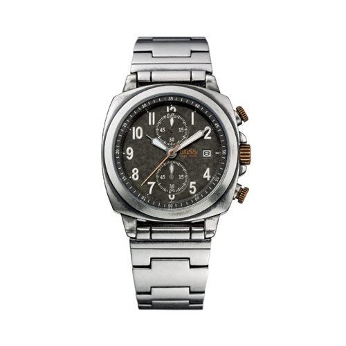 Item DescriptionHugo Boss antique looking stainless steel case and bracelet Chronograph watch, 1512132 . Featuring : – Black slightly textured dial.- Chronograph windows are slightly inset with fine silver numbers and white indices- Silver polished main hour numbers ; fine minute stick indicators (light silver). – Date display at 3 O’clock position. – A bronze seconds hand matches the Hugo Boss logo which is in bronze above the date display. – Hours and minutes hands are silver / glow-in-dark combination- The crown and selector buttons are bronze and crown has “BOSS” engraved on it.-; The crown controls both the time and the date on the dial. – Screen is scratch proof mineral crystal- Case ; case-back are antique finished stainless steel- Case-back features engraved logo- Bracelet strap is steel- Push button hidden deployment clasp with the Hugo Boss logo engraving. Brand new;in Hugo Boss gift box with documentation and warranty. |