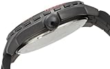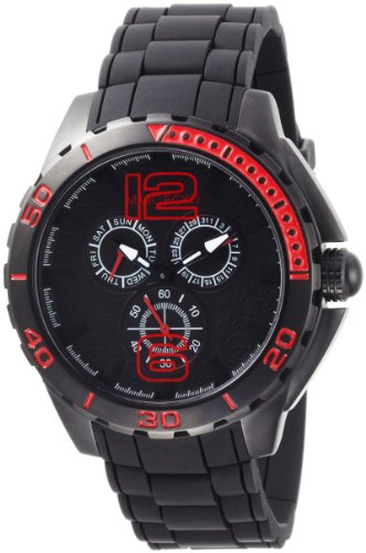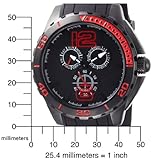 Item DescriptionCasual watch, Japanese quartz movement, Multifunction featuring day, date and continuous seconds subdials, Polished black sword hands with luminous accents, Polished red hands mark subdials, Red/transparent Arabic twelve and six, Applied black baton markers, White print, Arabic numbers and indices mark subdials, White indices form surrounding minute track, Black dial with textured skull and laurels pattern, Black bracelet-style polyurethane strap with brushed black Ion-plated stainless steel buckle, Brushed black Ion-plated stainless steel bezel with red ink fill and engraved Arabic numbers/baton markers, Brushed black Ion-plated stainless steel round case, Textured black Ion-plated steel crown, Stainless steel screw-down caseback, Mineral crystal |