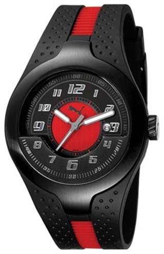Item DescriptionThis Puma watch is an excellent time piece the represents what Puma is all about. A round solid stainless steel case and black rubber band makes this watch look great on anyone. Featuring a black dial with red on the inner dial, luminous hands, white and grey accents, second hand, and date display at the 3 o’clock marker. This watch is water resistant to 50 meters (165 feet). |