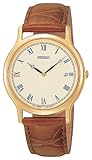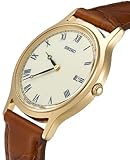 Item DescriptionA clean, classic timepiece, this Seiko Men’s Dress Watch is perfect for elegant evenings or everyday wear. Featuring a round, champagne dial with Roman numeral indices, a convenient date window at three o’clock, and trim, black hour and minute hands, all protected by a durable hardlex crystal, this watch utilizes reliable Japanese quartz movement. Also offering a 34-millimeter case and stationary bezel crafted from brass, a rich brown leather band, and a buckle clasp, this versatile watch is water resistant to 330 feet. |