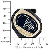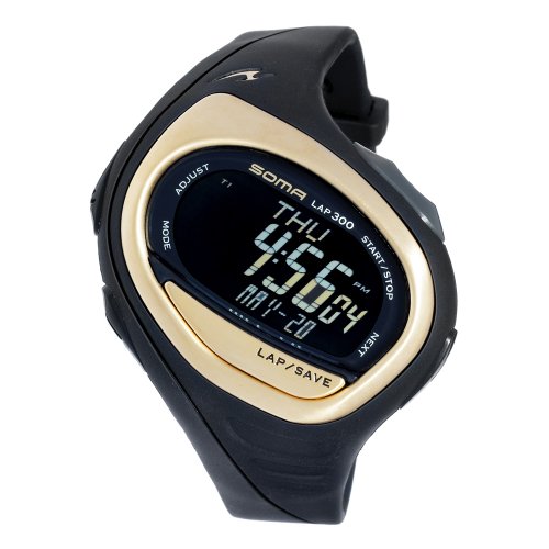 Item DescriptionWith a fun, angled shape, the Soma Unisex RunOne 300 Black and Gold Strap Digital Sports Watch offers a unique look to a high-quality timepiece. The digital black dial is set on the diagonal and features backlight glow so you can tell time in low light. This fully loaded watch offers two-phase chronograph timers, dual time zone function, and a calorie consumption calculator. With its 300-lap memory storage and water resistance to 330 feet (100 meters), the watch makes a great tool for swimming laps. The gold-toned, stainless steel bezel provides strength while a mineral crystal window offers scratch resistance. The strong, black polyurethane watch strap is secured with a buckle clasp. Ideal for active people who want an accurate, high-function timepiece, it’s also equipped with reliable quartz movement. |