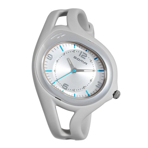 Item DescriptionThe Soma Women’s RunOne S White Strap Analog Sports Watch features a large, silver dial that’s placed diagonally for a fun look. The oval dial displays silver-toned, Arabic numeral indexes at three, six, nine, and 12 o’clock and turquoise, bar-shaped hour indexes at all other hours. It also offers luminous, silver-toned minute and hour hands, a turquoise seconds hands, a handy minute track, and a backlight for low-light conditions. The durable metal bezel and strong plastic case protect against daily wear and tear. The white, polyurethane watch strap is secured with a buckle clasp and features an open ‘S’ design on both sides of the dial. The trendy, high-function timepiece is equipped with reliable Japanese quartz movement and is water resistant to 165 feet (50 meters). |