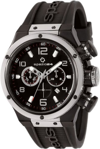 Item DescriptionA contemporary spin on the classic chronograph design, the Spazio24 Men’s Hi-Speed Chrono Black Dial Watch features a stainless steel case and a black silicone band that closes with a traditional buckle closure. Complementing these features is a black dial that features three subdials at the three, six, and nine o’clock positions, luminous silver-toned hands, and the Spazio24 namesake and logo at the twelve o’clock position. The dial also features a date window between the four and five o’clock position and a stylish mix of luminous baton and silver-toned Arabic hour markers. A mineral crystal protects this dial. Other features include a stainless steel screw-down bezel, an oversized crown flanked by two pushers, reliable Japanese quartz movement, and water-resistance to 330 feet (100 meters). |