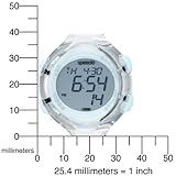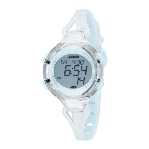 Item DescriptionDigital quartz movement, Chronograph featuring stopwatch with 5-second countdown option, split time readings and elapsed time measurement, 150-lap recall function, Interval training timer programmable up to 10 intervals, Dual time zone display, Toggling between 12 and 24-hour format, Hourly chime and 3 independent alarms, Backlight with afterglow, Positive (dark-on-light) digital numbers, Digital day-date-and-month display, Calendar year to 2099, Molded aqua bezel indicating functional modes etched with Speedo logo, Clear/aqua translucent polycarbonate case with scratch-resistant coating, Aqua ‘Hydro Pushers’ selector buttons can be pushed at pressure of 3 ATM, Stainless steel caseback, 100 meters/330 feet water resistant |