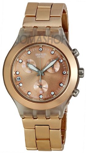 Item DescriptionPlastic case with a brown ion-plated aluminum bracelet. Fixed translucent bezel. Brown dial with luminous hands and crystal hour markers. Minute markers around the outer rim. Luminiscent hands. Date display appears between the 8 and 9 o’clock position. Three – 60 minutes, 60 seconds and 1/10th of a second. Swiss eta quartz movement. Scratch resistant plastic crystal. Octagonal-shaped crown. Solid case back. Case diameter : 42 mm. Deployment clasp. Water resistant at 30 meters / 100 feet. Functions : hours, minutes, seconds, chronograph. Swatch Full Blooded Brown Unisex Watch SVCK4047AG. |