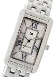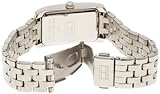 Item DescriptionDress watch, Japanese quartz movement, Polished silver-tone hands with polished navy blue sweep seconds, Applied polished navy blue/silver-tone Roman numerals mark even-hour positions, Applied polished silver-tone baton markers, Navy blue indices form inner ornamental minute track, White mother-of-pearl dial with brushed silver-tone center panel and red/white/blue logo applique, Polished silver-tone stainless steel bracelet with adjustable links and push-button-clasp, Polished silver-tone stainless steel rectangular case, Textured steel crown, Stainless steel caseback, Mineral crystal, Water resistant |