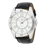 Item DescriptionSilver-tone round case joint with black strap band, buckle closure. Silver dial with a mix of Arabic numerals and sticks. Black minute tracks printed on bezel. This timepiece is also powered by precise Japanese quartz movement. |