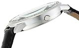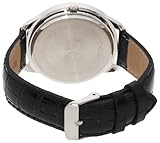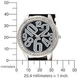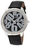 Item DescriptionLarge shiny silver-tone round case with 43.8 mm diameter, clear rhinestone accent bezel, unique designed dial with black background and irregular glitter accent Arabic numerals, black crocodile strap watch with buckle closure. This timepiece is powered by Japanese quartz movement. |